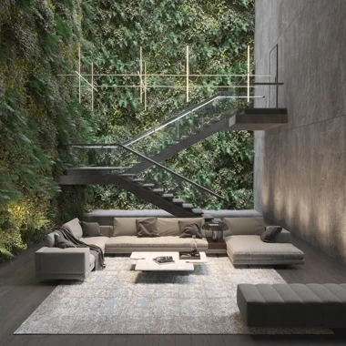 For most living rooms, this means an area rug of at least 240 x 300 cm. Larger rooms. 300 x 400 cm or more. Leave 20 to 30 cm of floor visible between the rug edge and the wall. A rug that runs wall-to-wall without actually being wall-to-wall carpet looks like a mistake.